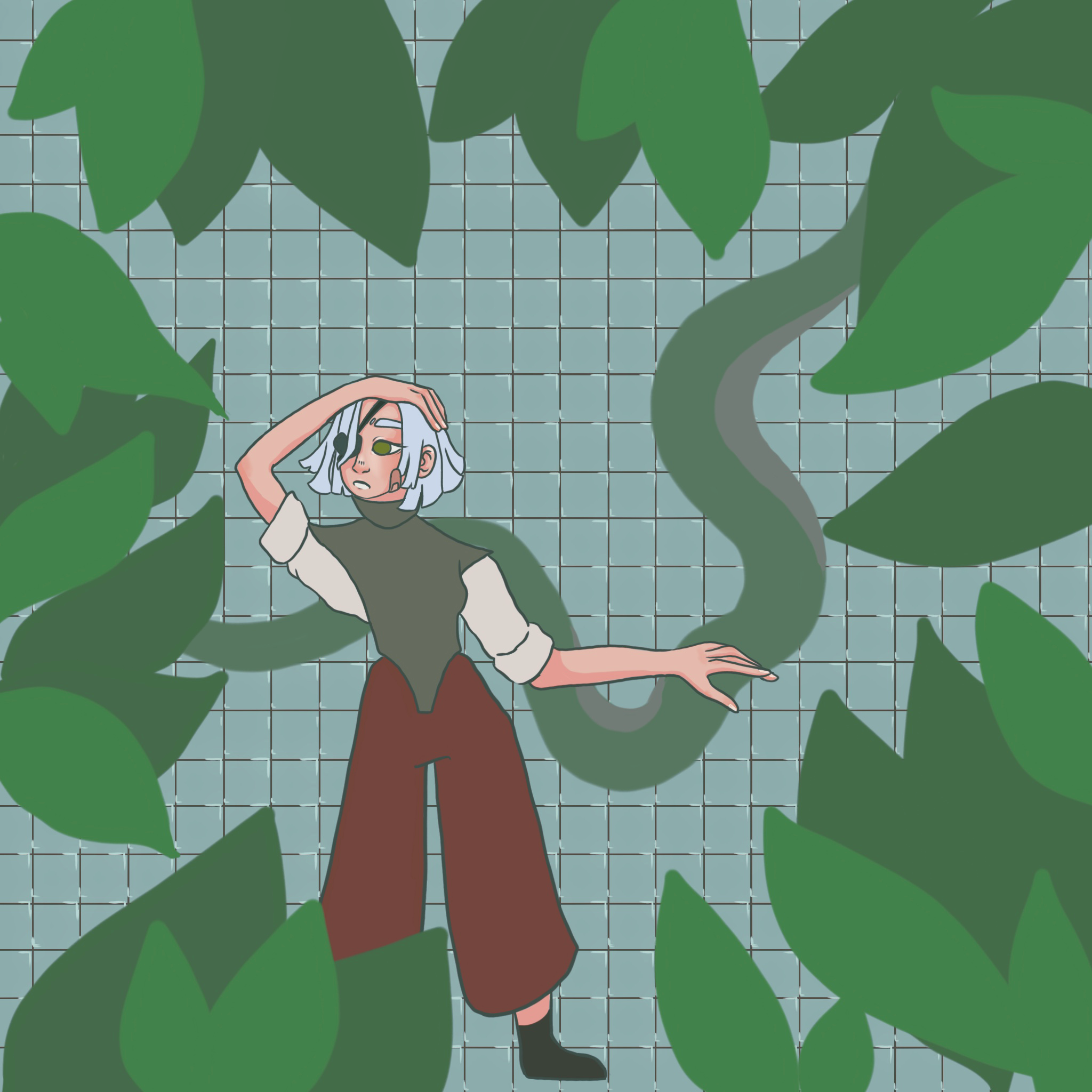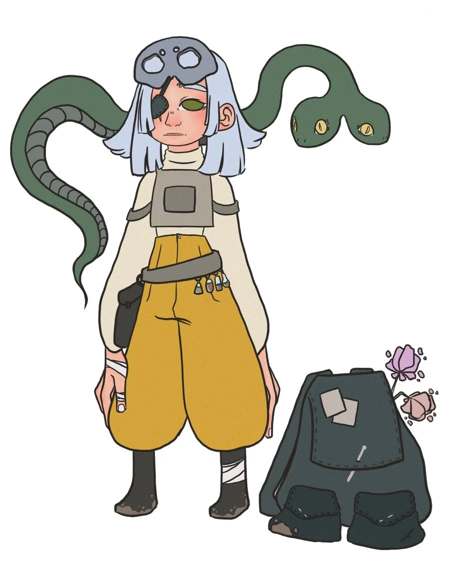 Lilith's fashion mirrors my own style, featuring loose, flowing shirts and pants, layered outfits, and a muted color palette that reflects my personal wardrobe. Her look was adapted to suit her wild environment, emphasizing protection, utility, and mobility. Lilith's fashion, eye patch, and snake companion are all elements inspired by my own life, reimagined to fit her new reality.