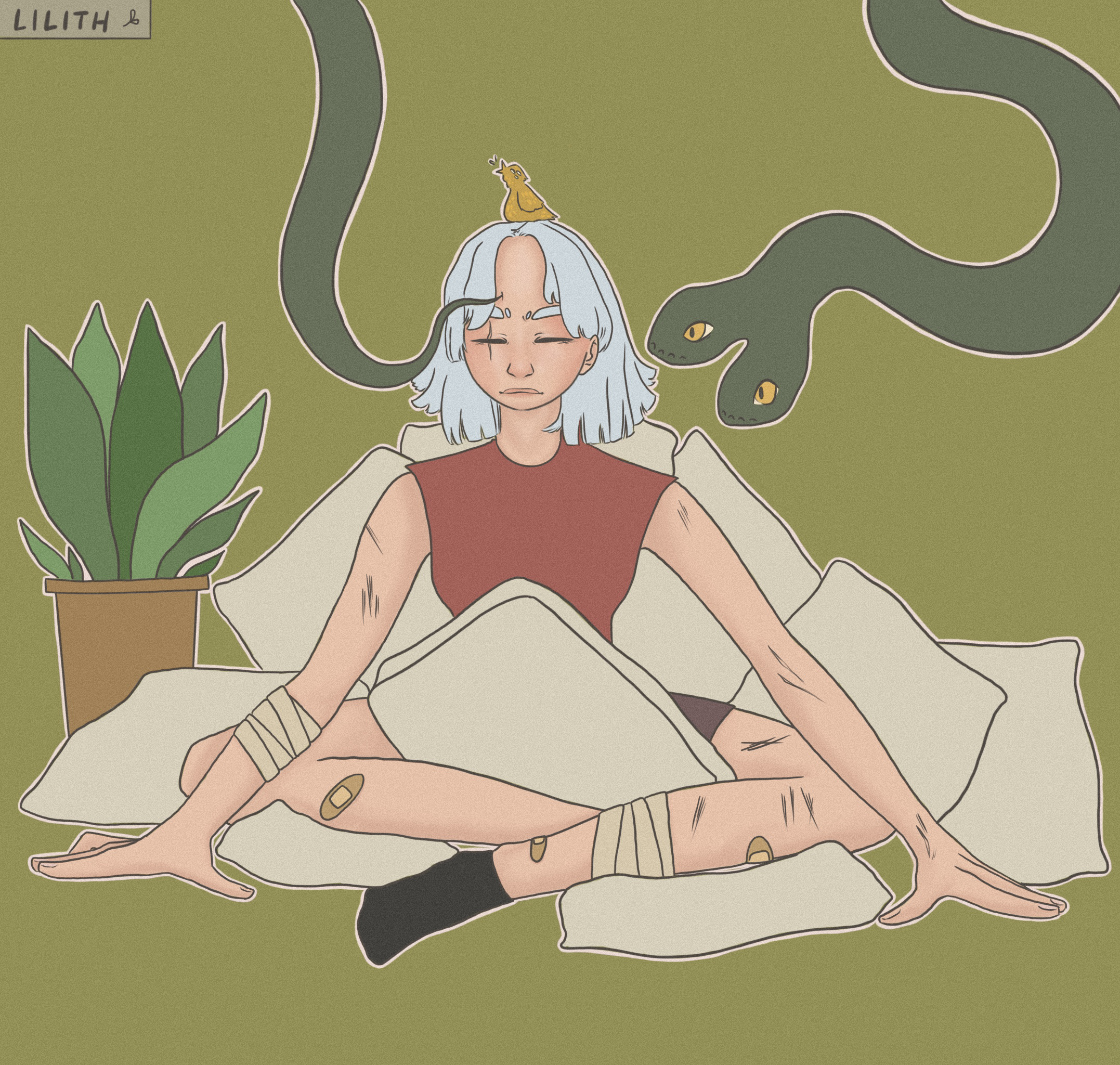 Inside her cozy home, Lilith finds peace like never before, spending quiet moments meditating and thinking. Her snake companion is always close by, keeping her company.